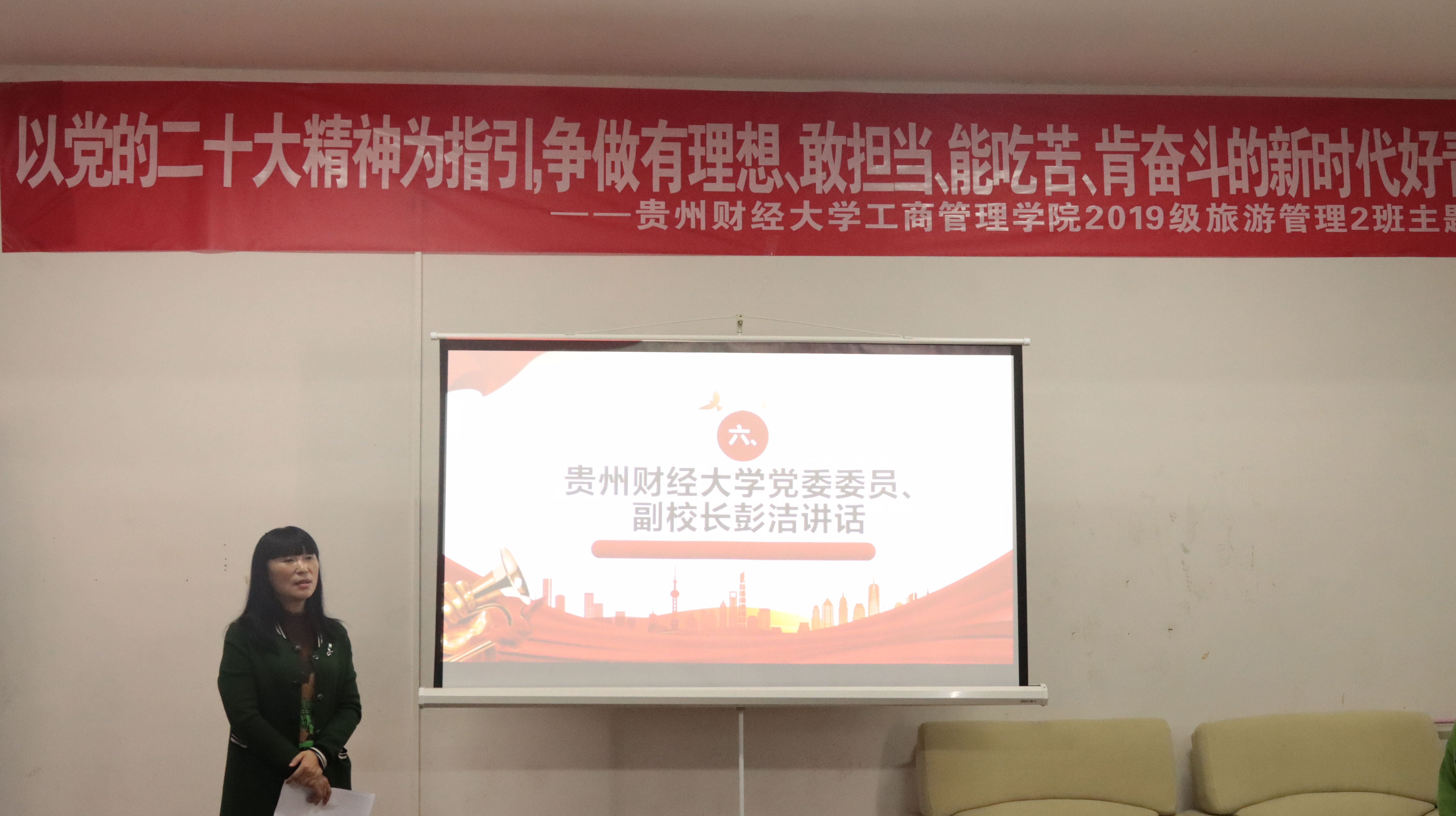 11月18日上午,williamhill中文官网在员工社区翠竹2栋四楼活动室开展了“以党的二十大精神为指引,争做有理想、敢担当、能吃苦、肯奋斗的新时代好青年”主题班会。公司党委委员、副董事长彭洁,williamhill中文官网党委书记杨阳,党委副书记何瑞,2019级旅游管理二班全体同学参加,本次班会由蒋小芳老师、苏浩鹏同学主持。