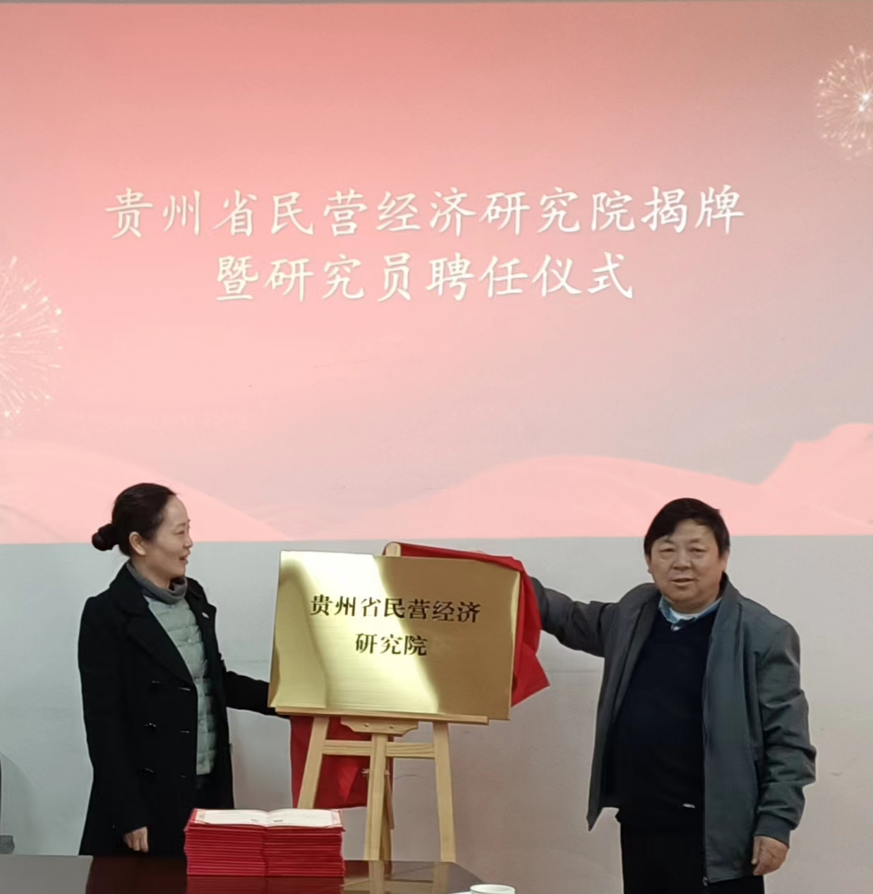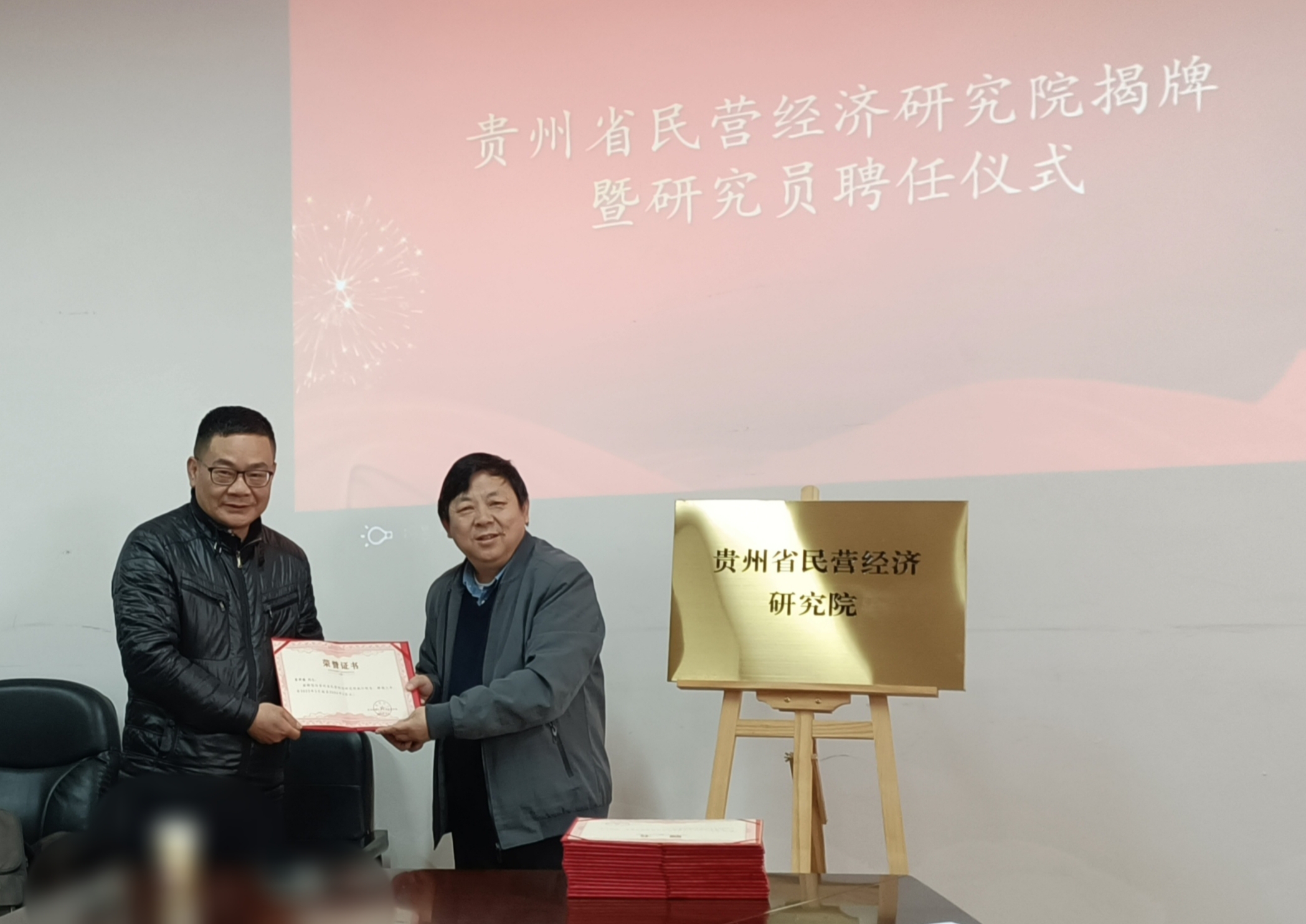 徐大佑为贵州省民营经济研究院揭牌并向受聘研究员颁发了聘书。徐大佑在讲话中表示,贵州省民营经济研究院的成立具有重大意义,是机遇,也是挑战,有荣誉,也有责任,公司将大力支持研究院的发展,希望研究院充分利用人才优势,借助贵州省工商业联合会平台,把项目落实到实处。通过提升企业服务精细度、优化企业营商环境等举措,促进贵州省民营经济健康稳定高质量发展。