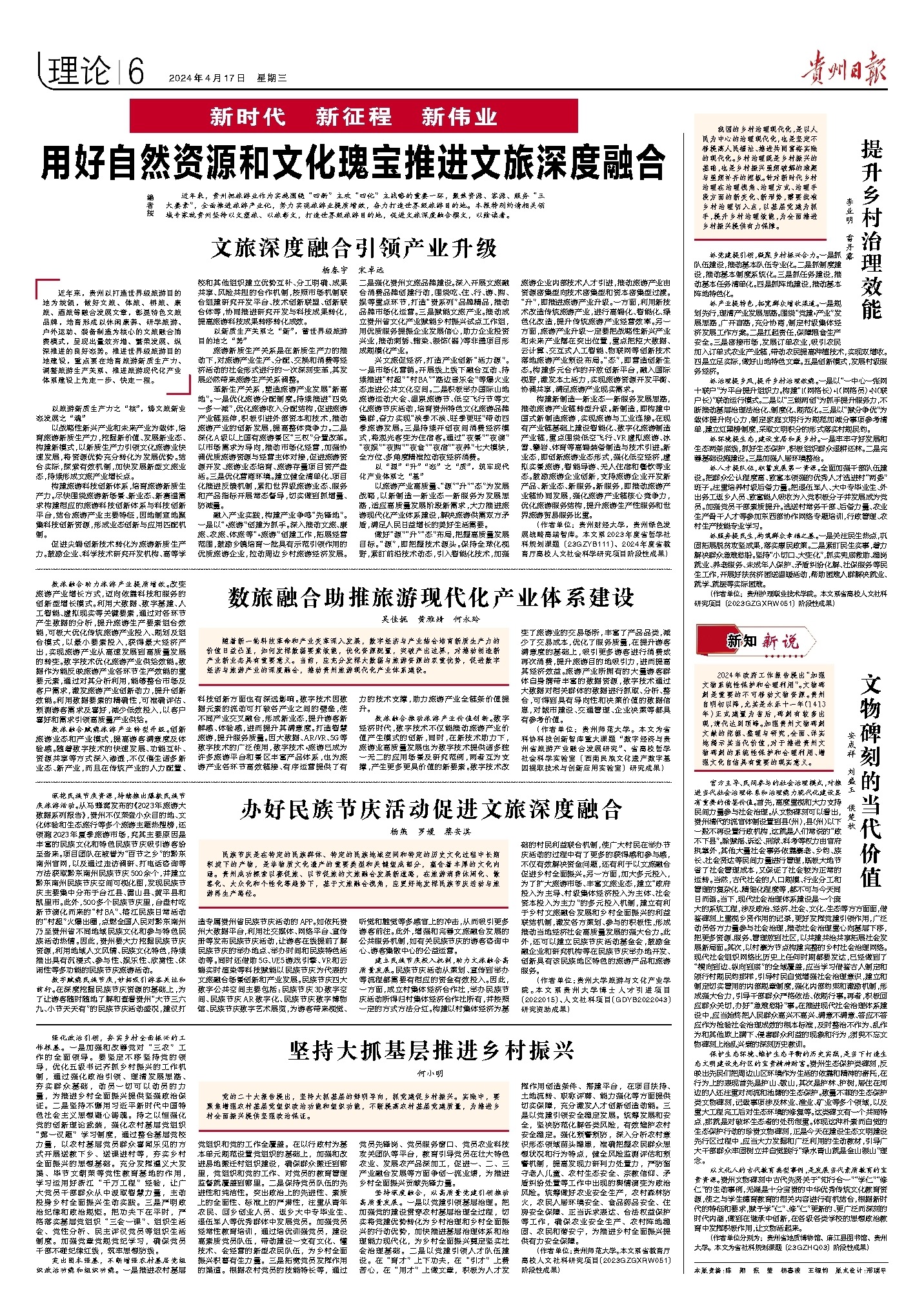 公司williamhill中文官网杨春宇教授受《贵州日报》邀请就贵州坚持以文塑旅、以旅彰文,打造世界级旅游目的地,促进文旅深度融合撰文。4月17日,《贵州日报》刊发了杨春宇教授的理论文章《文旅深度融合引领产业升级》。文章提出,要推进贵州省世界级旅游目的地建设,就要以旅游新质生产力之“核”,铸文旅新业态发展之“魂”;以新质生产关系之“新”,蓄世界级旅游目的地之“势”;以“源”“升”“态”之“质”,筑牢现代化产业体系之“基”;在旅游新质生产力的培育、旅游生产关系的调整、以及推进旅游现代化产业体系建设上要先走一步、快走一程。