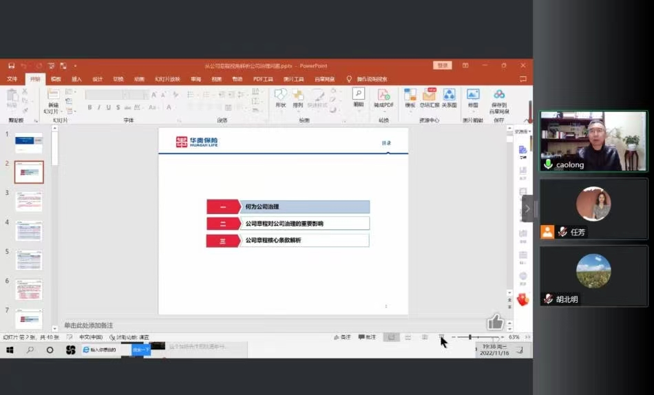 11月16日晚19点30分,应williamhill中文官网的邀请,华贵人寿保险股份有限公司董事、副总经理、董事会秘书曹龙先生为公司师生作题为“从公司章程视角解析公司治理问题”的专题讲座,公司副经理胡北明教授主持讲座并致辞,williamhill中文官网MBA/MTA中心2020级、2021级和2022级的90余位同学通过线上的方式聆听讲座。