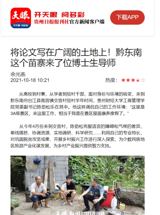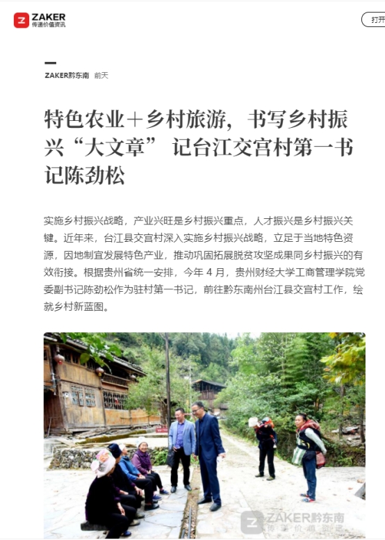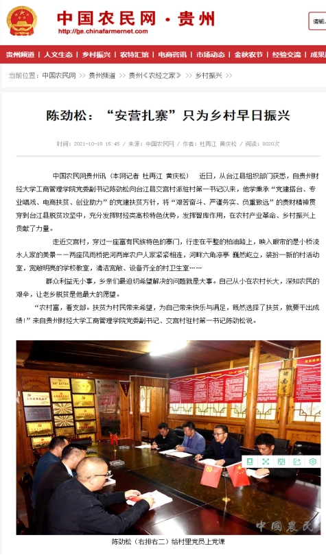今年4月,公司党委副书记、市场营销专业博士、教授、博士生导师、国家级一流专业(市场营销专业)负责人陈劲松派驻黔东南州台江县交宫村。作为驻村第一书记,陈劲松积极带领党员发挥党组织战斗堡垒作用,克服各种障碍,牵线搭桥、协调资源、实地调研、科学研究……利用自己专业特长,对巩固脱贫攻坚成果、开展乡村振兴工作积极探索,为少数民族地区旅游产业谋发展,为乡村产业振兴提供智力支持。陈劲松的工作成效,得到了多方尤其是村民的广泛肯定和赞誉。