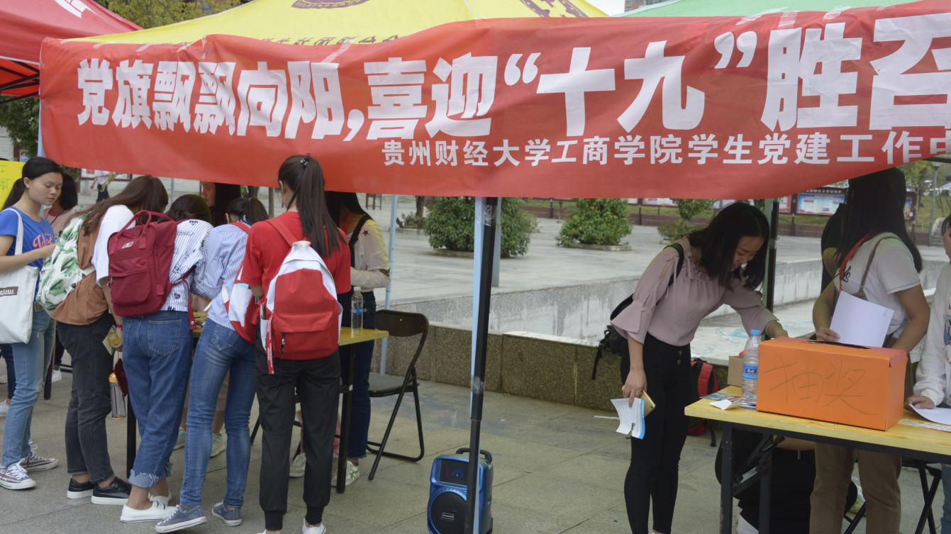 在中国共产党第十九次全国代表大会来临之际,工商公司员工党建工作中心开展了历时一个星期的主题拍摄活动,首先,在五四广场举行了以“党旗飘飘向阳,喜迎十九胜召”为主题的党知识问答,以及与党旗合影活动。其次,拍摄了工商公司党委书记余颂、党委副书记范嘉虹、党委副书记陈劲松、办公室副主任童彩华老师,以及全校师生员工送出的诚挚祝福。