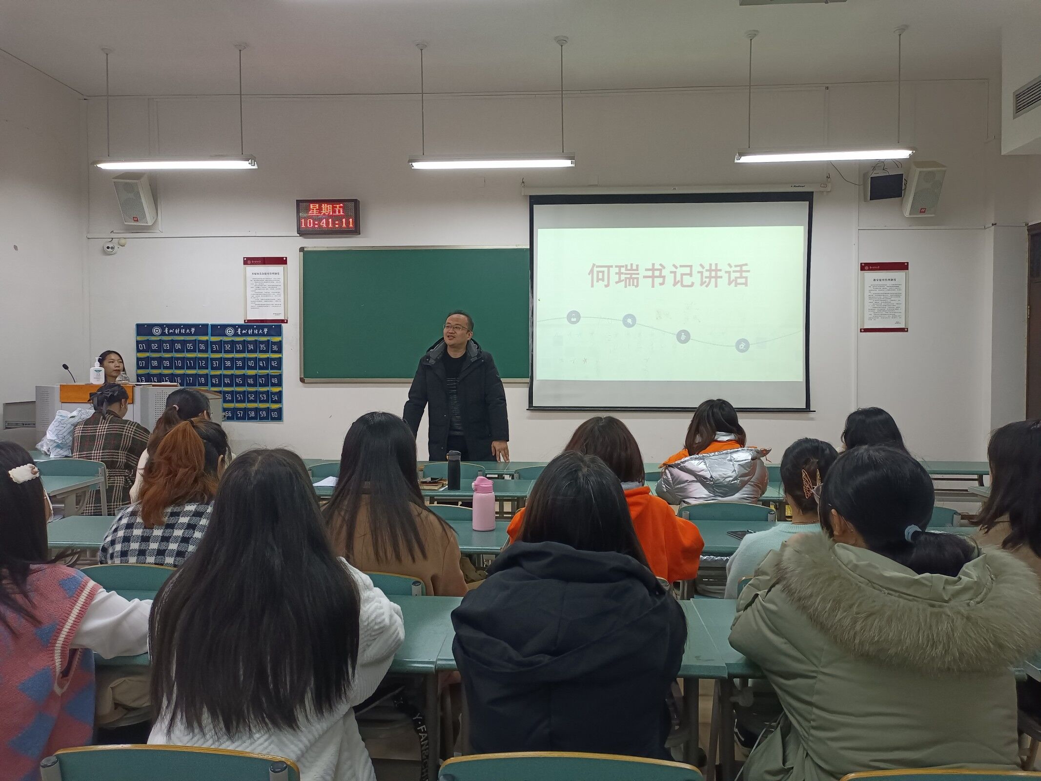 随后,何瑞发表讲话,他对同学们提出了三点建议,一是希望大家能够珍惜时光,努力学习;二是要对自己所学专业要有信心,相信学好专业知识可以成就更好的自己;三是趁自己还年轻,有梦想就去追寻,我们处在第二个百年奋斗目标的起点上,一定会在中国这艘高速发展的巨轮上看到更美的风景。最后祝福同学们,在未来的学业中取得更好的成绩,为实现伟大的中国梦不断而不懈奋斗。