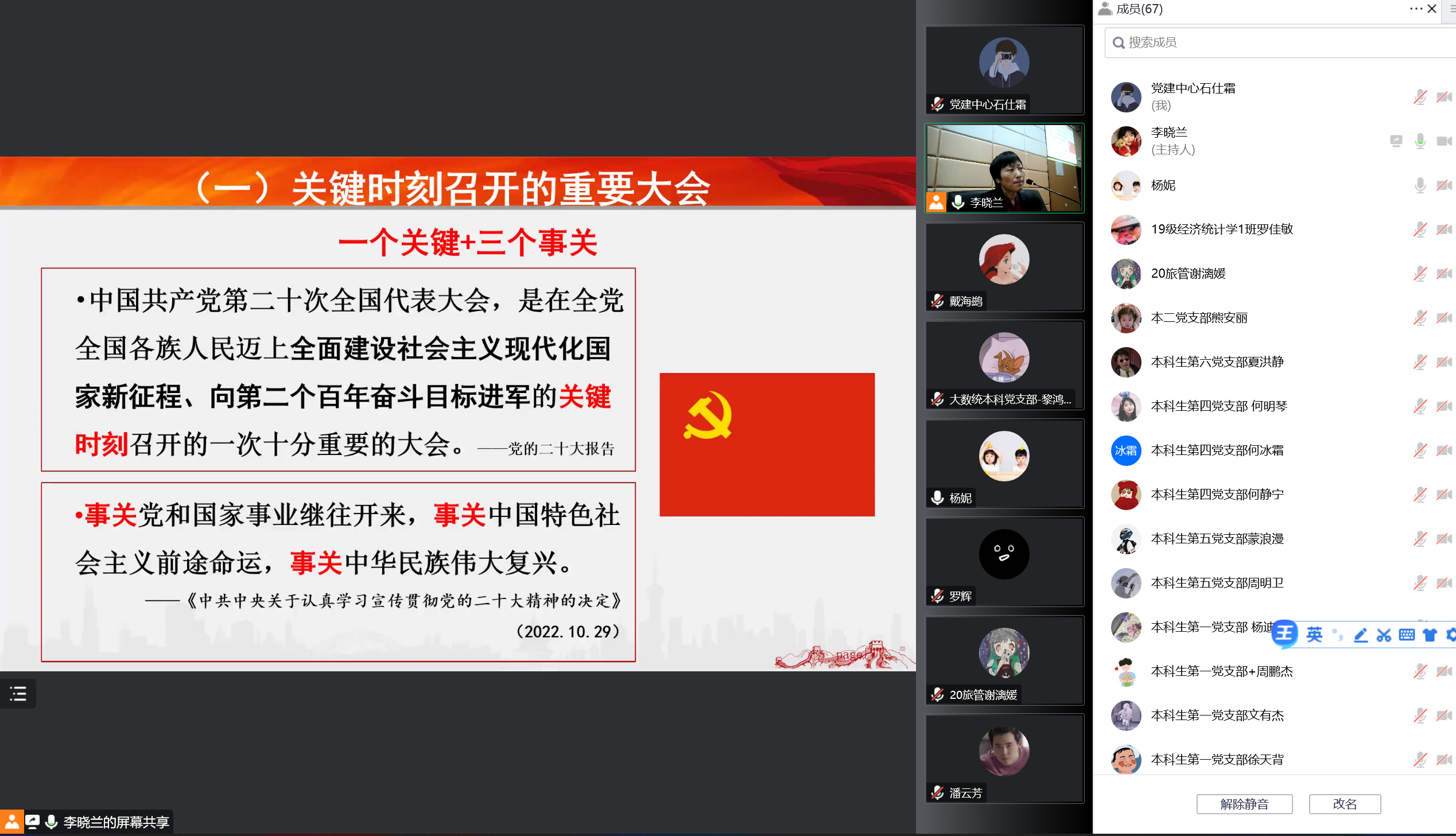 李晓兰从深刻认识党的二十大召开的意义、全面把握党的二十大精神的主要内容、贯彻落实党的二十大的基本要求这三个方面进行讲解和阐释。对于二十大精神的主要内容,她对过去五年的工作成就和新时代十年的伟大变革、中国共产党的指导思想、使命任务、谋篇布局等内容进行了详细地讲述。她着重阐述了在中国共产党的领导下,中国在经济建设、发展引擎、政治建设、国家治理、文化建设、社会建设、生态建设、国家安全、国防军队、祖国统一、外交、党的建设等十二个方面取得的伟大成就。她让大家牢记,中国共产党为什么能,中国特色社会主义为什么好,归根到底是马克思主义行,是中国化时代化的马克思主义行。