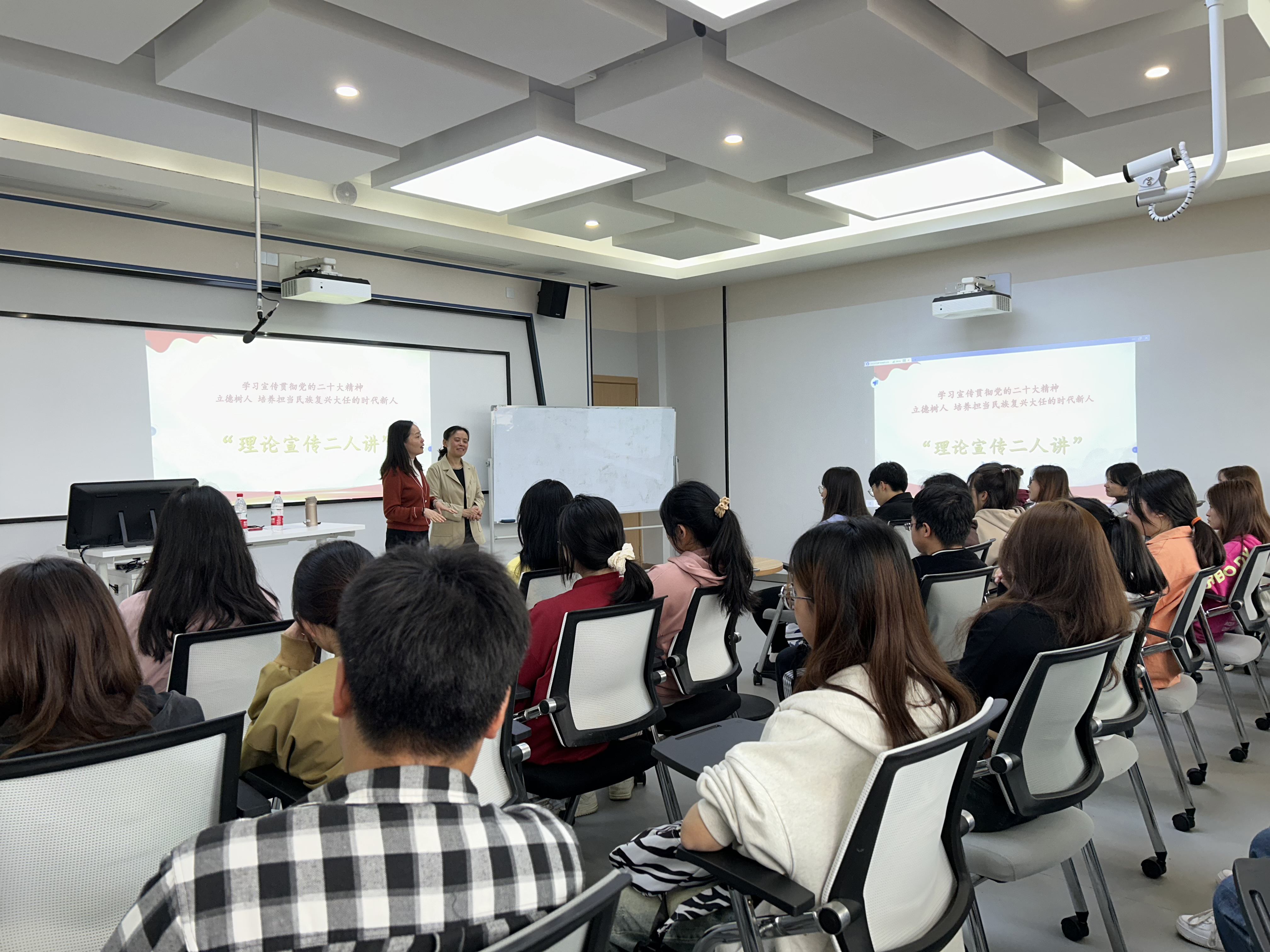 4月23日,williamhill中文官网党委书记杨阳、副教授黎开莉在崇德楼智慧教室开展“学习宣传贯彻党的二十大精神 立德树人 培养担当民族复兴大任的时代新人”理论宣传二人讲活动。