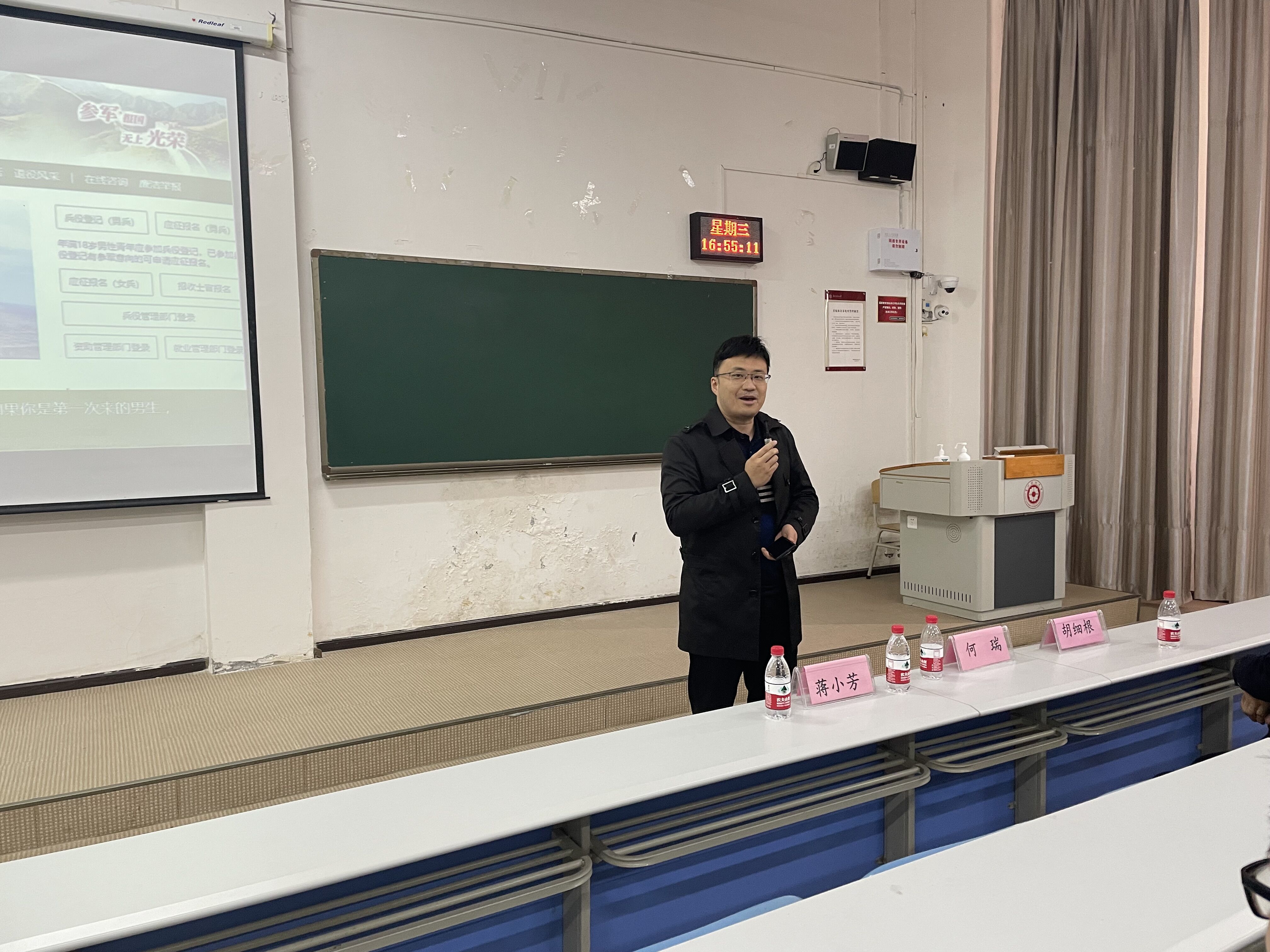 首先由武装部胡细根老师进行宣讲,胡老师提到:第一,在身体素质和政治条件允许的情况下,积极鼓励同学们去参军入伍;第二,作为一名军人我们既可以发展个人素质也可以实现自身价值,报效祖国;第三,现在国家对于参军入伍的同学的福利和政策一直在不断的提高,大家要积极相应国家政策,努力把握机会。