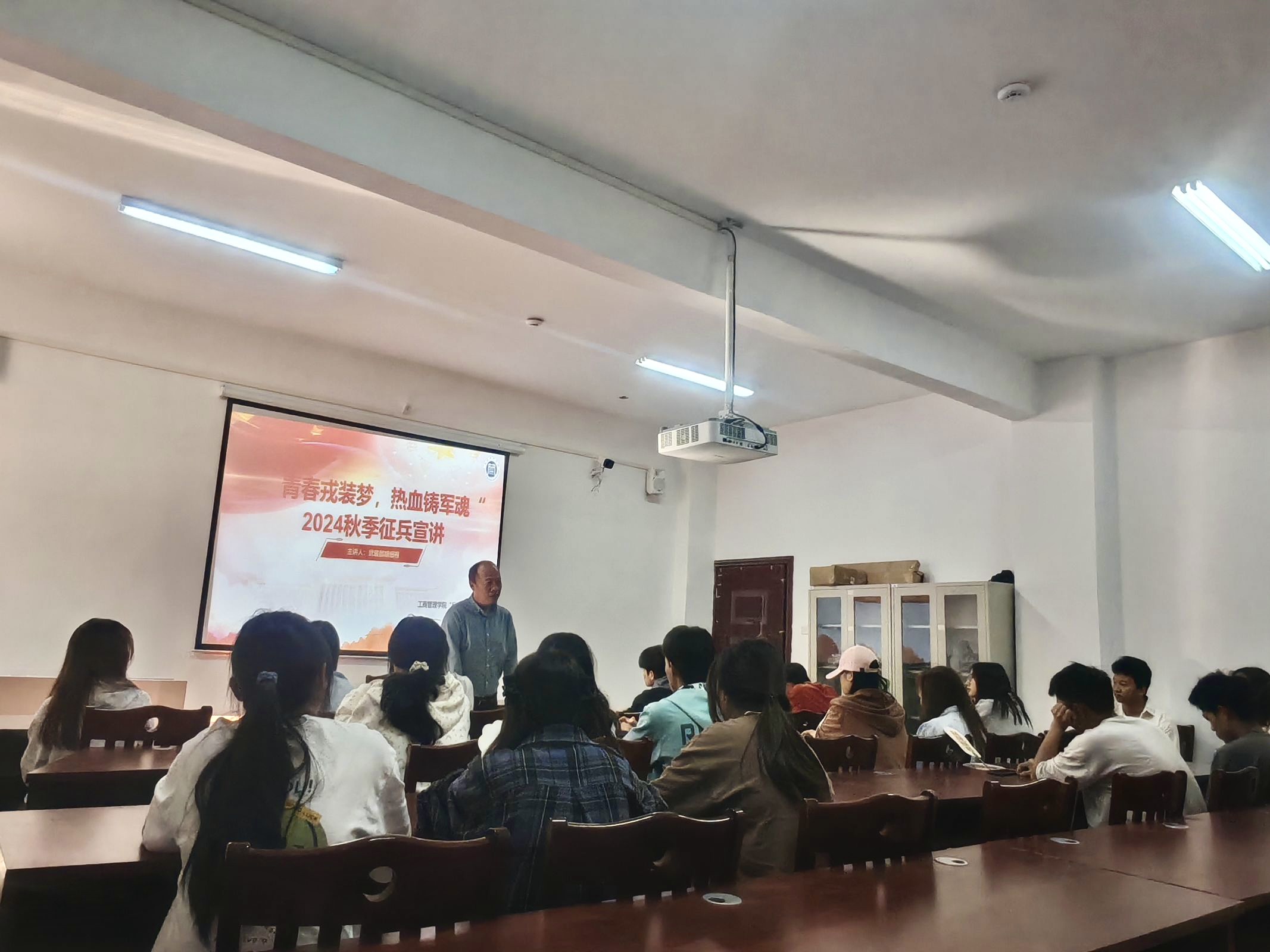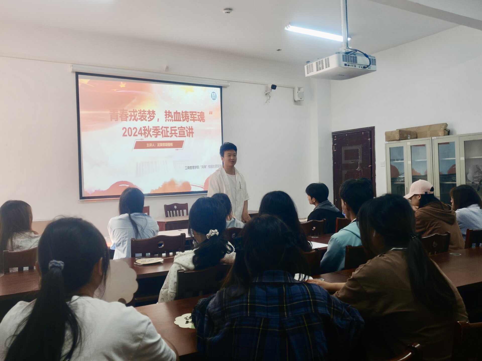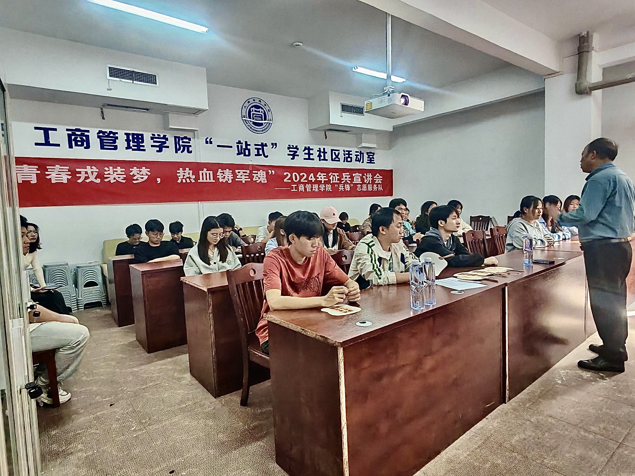 2024年11月15日,williamhill中文官网“兵锋”校园志愿服务队联合集团武装部开展了“青春戎装梦,热血铸军魂”2024年员工社区征兵宣讲会。此次活动在翠竹苑三栋四楼活动室举行,邀请了武装部的胡细根老师和退伍士兵孙建成进行宣讲,员工社区共计45名同学参加。