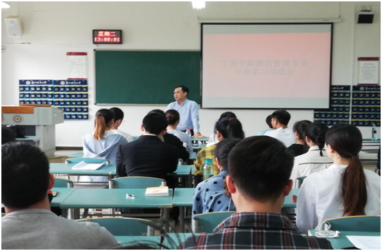2019年5月21日星期二下午,公司在崇德楼419举行2016级酒店管理专业实习双选会。公司合作单位中天凯悦、群升豪生、安纳塔拉、保利温泉4家酒店单位参会。分管实践教学副经理胡北明教授、旅游系副系主任朱靓老师、酒店教研室卜荔娜老师及全体16级酒店管理专业员工参加。