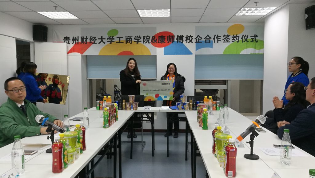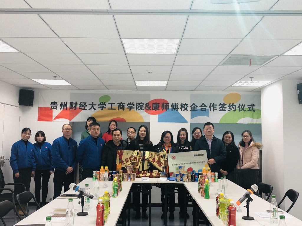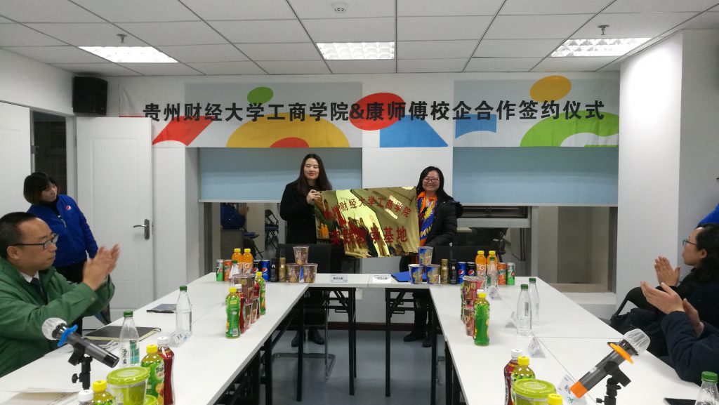 2018年12月18日下午,williamhill中文官网工商公司与康师傅控股有限公司校企战略合作签约暨实习基地授牌仪式在康师傅控股有限公司贵阳联合办公室顺利举行。康师傅控股有限公司西南区主任谭莉、康师傅百饮实业贵州行销公司总经理何淙、康师傅饮品实业贵阳碳水厂厂长张政及各人资部主任、williamhill中文官网工商公司经理肖小虹、工商公司副经理胡北明、工商系、物流营销系各系副主任、实践办同志参加本次签约、授牌仪式。